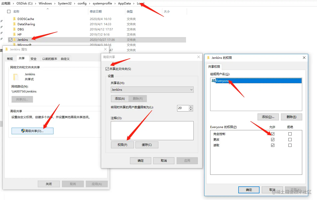 14、解决方案,找到 C:\windows\system32\config\systemprofile\AppData\Local\Jenkins\文件夹,右键Jenkins 文件夹,选择属性,然后在共享选项中点击高级共享,选中"共享此文件夹",然后点击权限按钮,赋予Everyone 完全控制的权限。