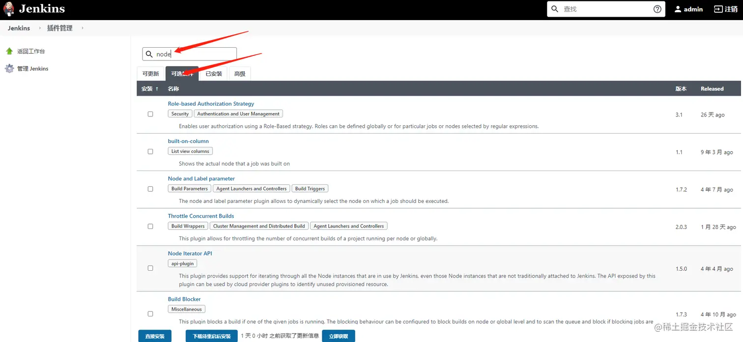 2、选择选择"可选插件",然后输入node进行搜索,选择 NodeJS Plugin 插件,点击直接安装,由于我这里已经安装过了,所以没有在可选插件中显示。