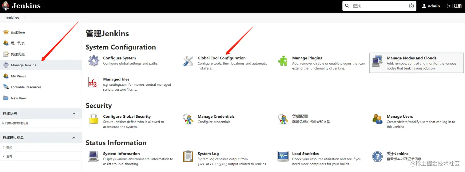 3、返回首页,点击 Manage Jenkins 选项,然后点击 Global Tool Configuration ,对node进行配置。
