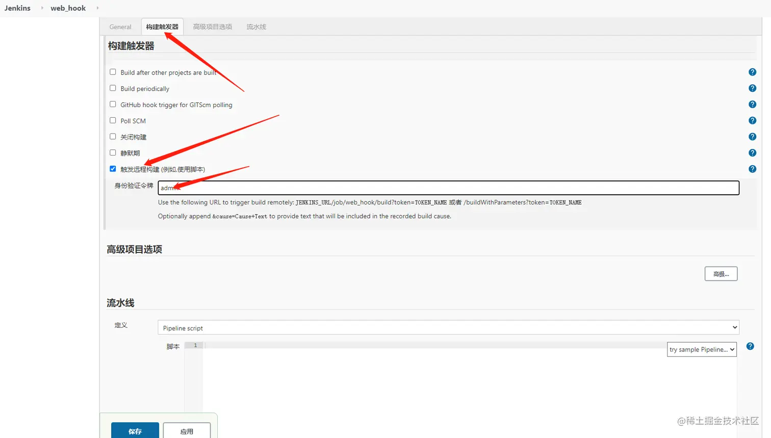 3、在构建触发器中选择"触发远程构建",并输入刚刚添加的token。