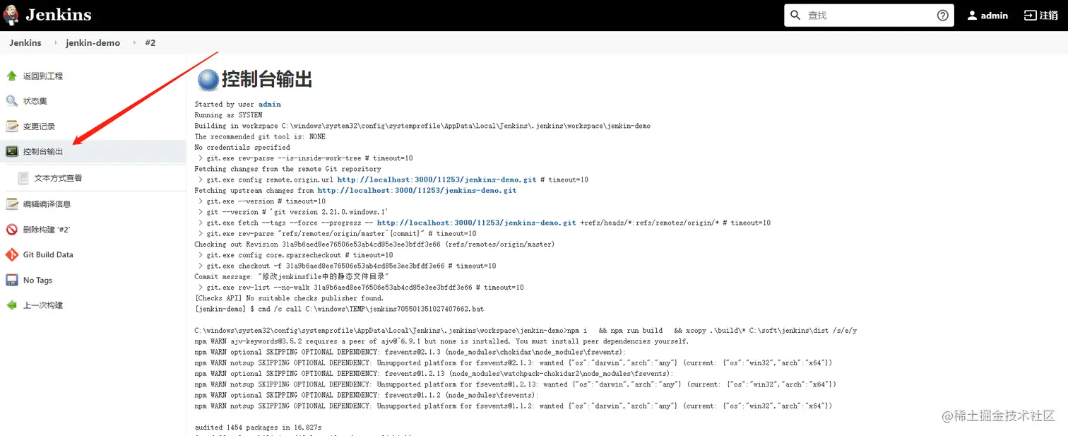 12、控制台输入日志中如果提示seccess则为构建成功,否则就是失败了。