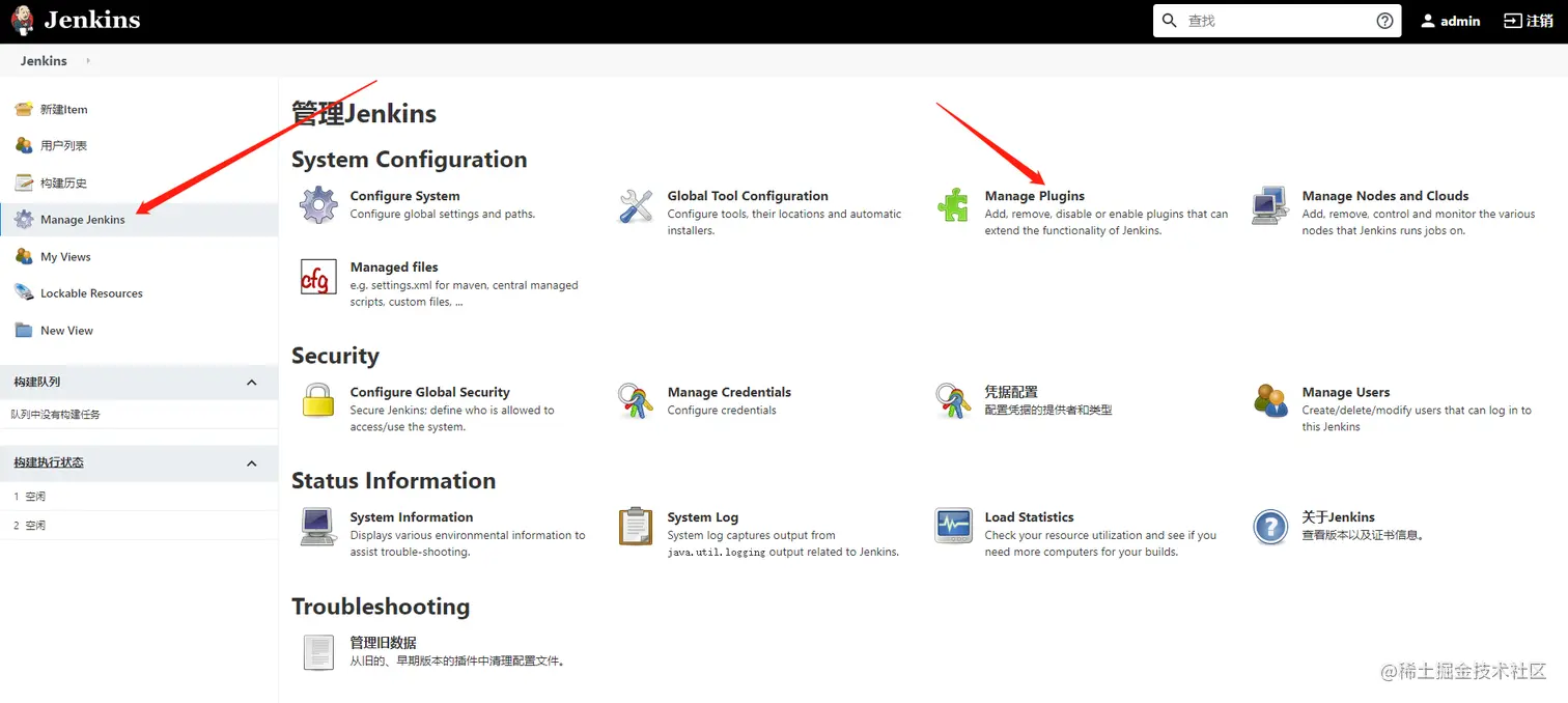 1、在jenkins首页点击 Manage Jenkins 选项,然后点击 Manage Plugins。