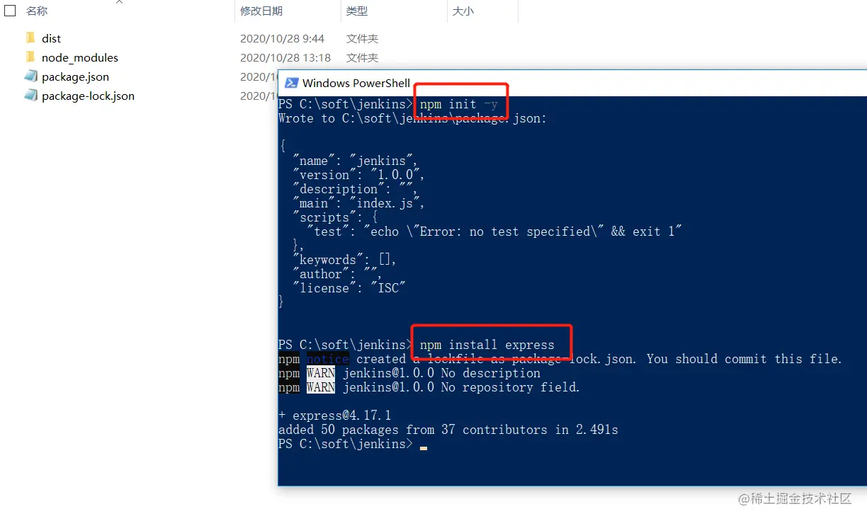 16、在dist同级目录中打开命令行工具,然后依次输入 npm init -y 和 npm install express 命令。