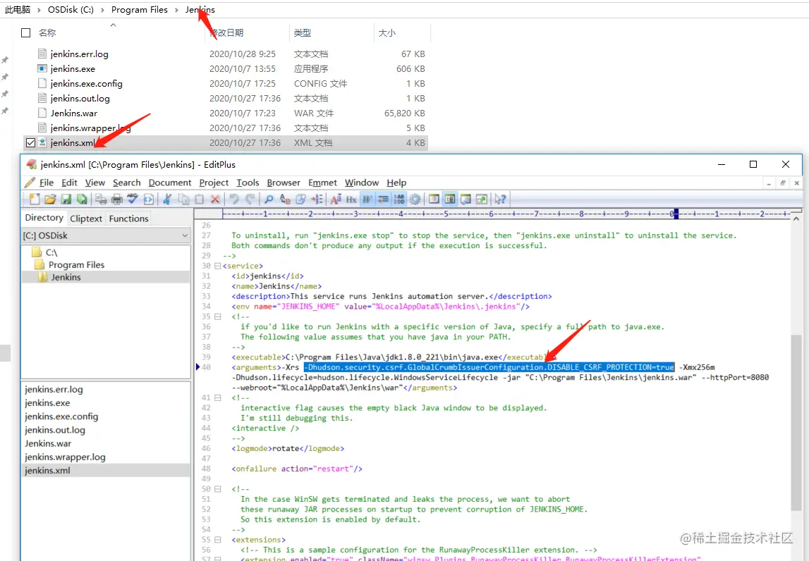 5、在jenkins的安装目录中找到jenkins.xml,在<arguments>标签中添加以下代码 -Dhudson.security.csrf.GlobalCrumbIssuerConfiguration.DISABLE_CSRF_PROTECTION=true ,作用是关闭CSRF验证,在Jenkins目录中打开命令行,并输入 ./jenkins.exe restart 重启 Jenkins。