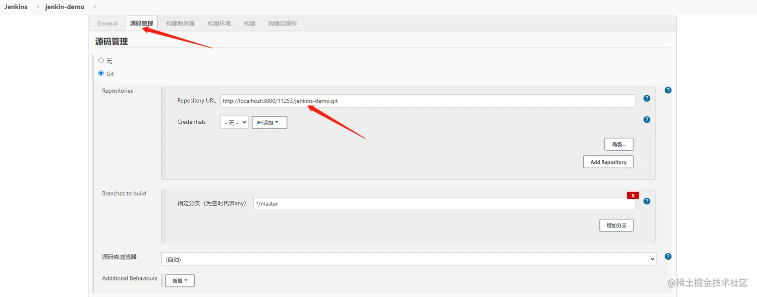 5、在源码管理中选择Git,并输入你刚刚创建的仓库地址。