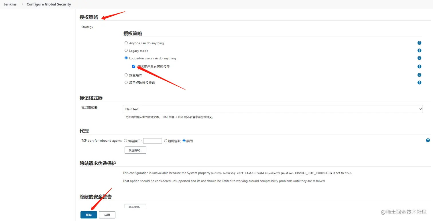 6、返回首页,在Manage Jenkins 中点击 Configure Global Security 。在授权策略中勾选"匿名用户具有可读权限",然后点击保存按钮。