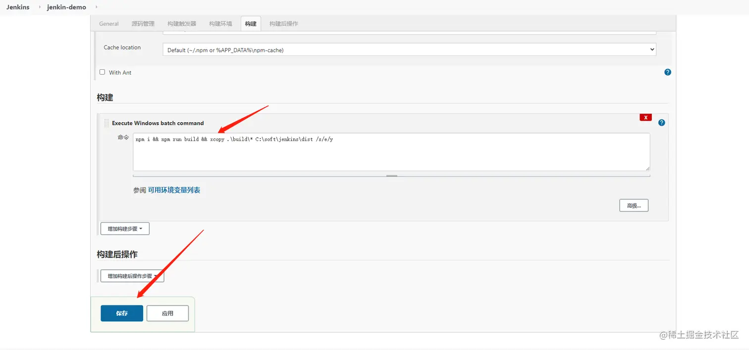 9、在命令输入框中输入 npm i && npm run build && xcopy .\build\* C:\soft\jenkins\dist\ /s/e/y ,然后点击保存按钮,注意,这里的 C:\soft\jenkins\dist\ 是你刚刚创建的静态服务器资源目录。运行这条命令以后,jenkins会自动安装依赖并打包,然后将打包后的静态资源文件复制到 C:\soft\jenkins\dist 目录下。
