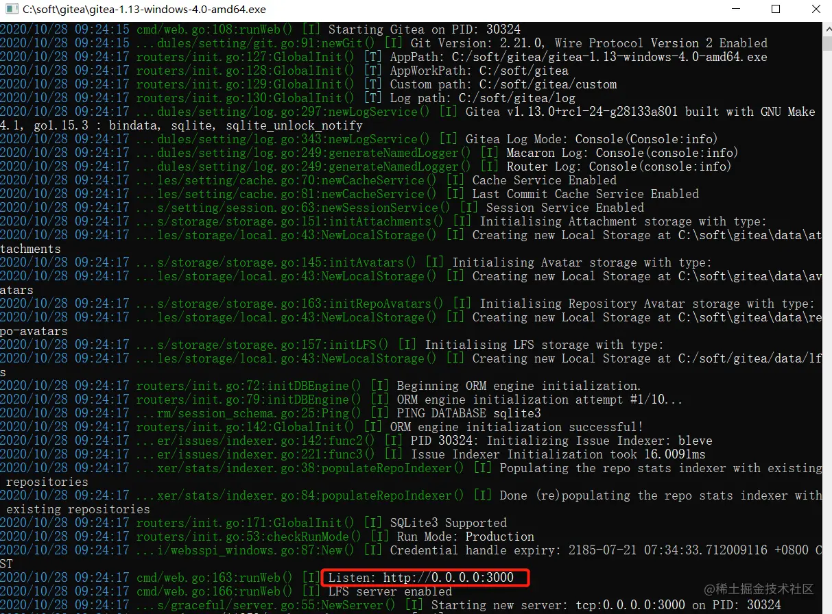 2、gitea文件不需要安装,双击即可使用,右键gitea文件以管理员权限运行,运行后如果显示这样的信息,就说明已经启动了,默认端口为3000.
