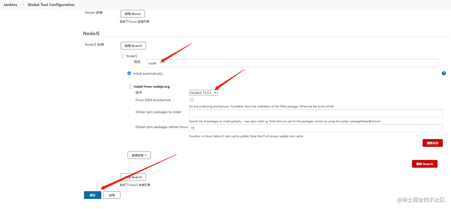 4、在 NodeJS 选项中新增NodeJS,填写好别名以及选择需要安装的NodeJS的版本,最后点击保存按钮。