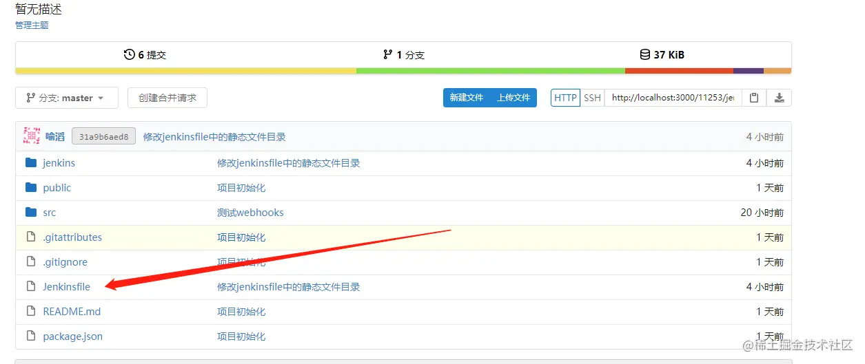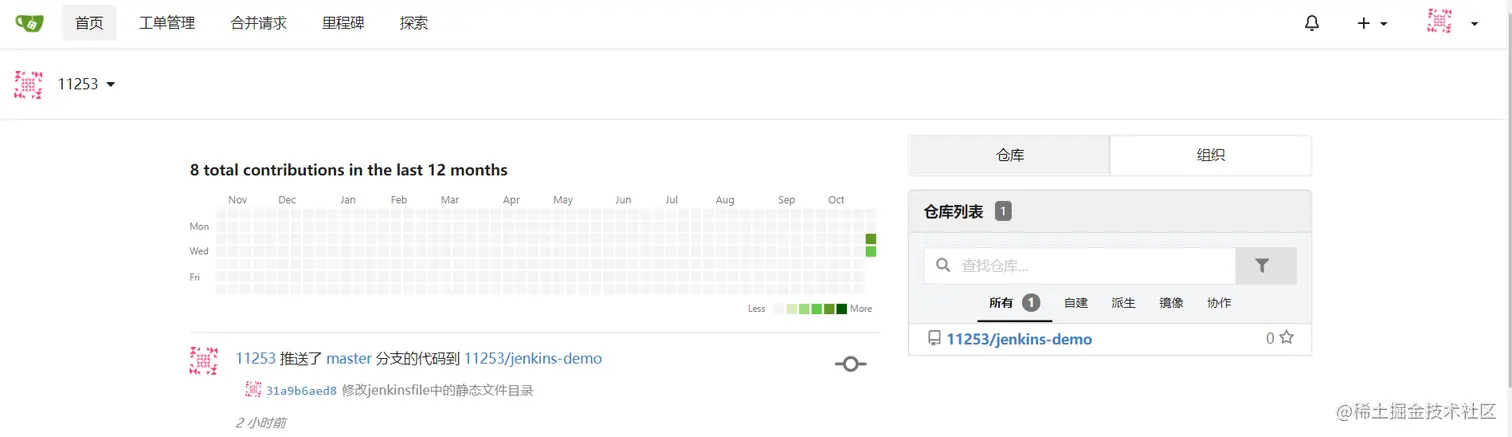 2、在本地创建一个Vue或React项目,然后将代码提交到刚刚创建的仓库中,这里也不再手把手教了。