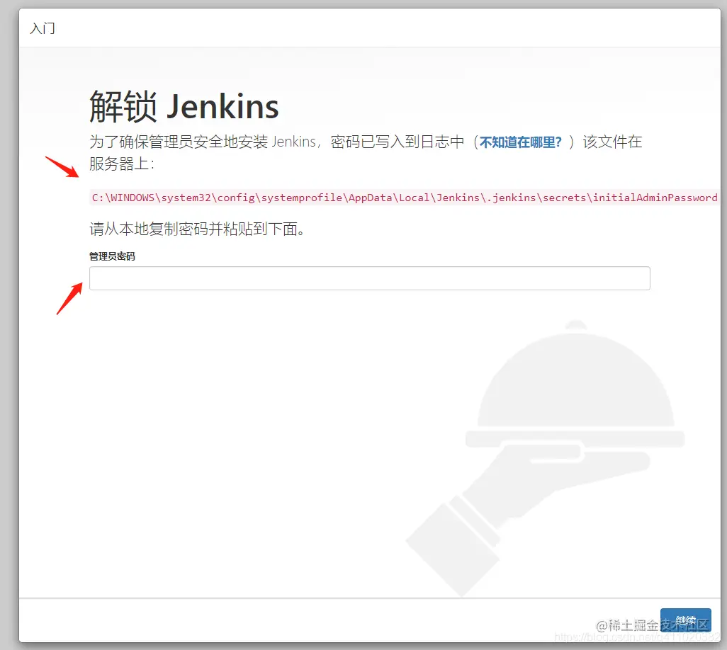 2、在打开的网站中找到对应文件,然后将文件中的内容复制到管理员密码输入框中,点击"继续"。
