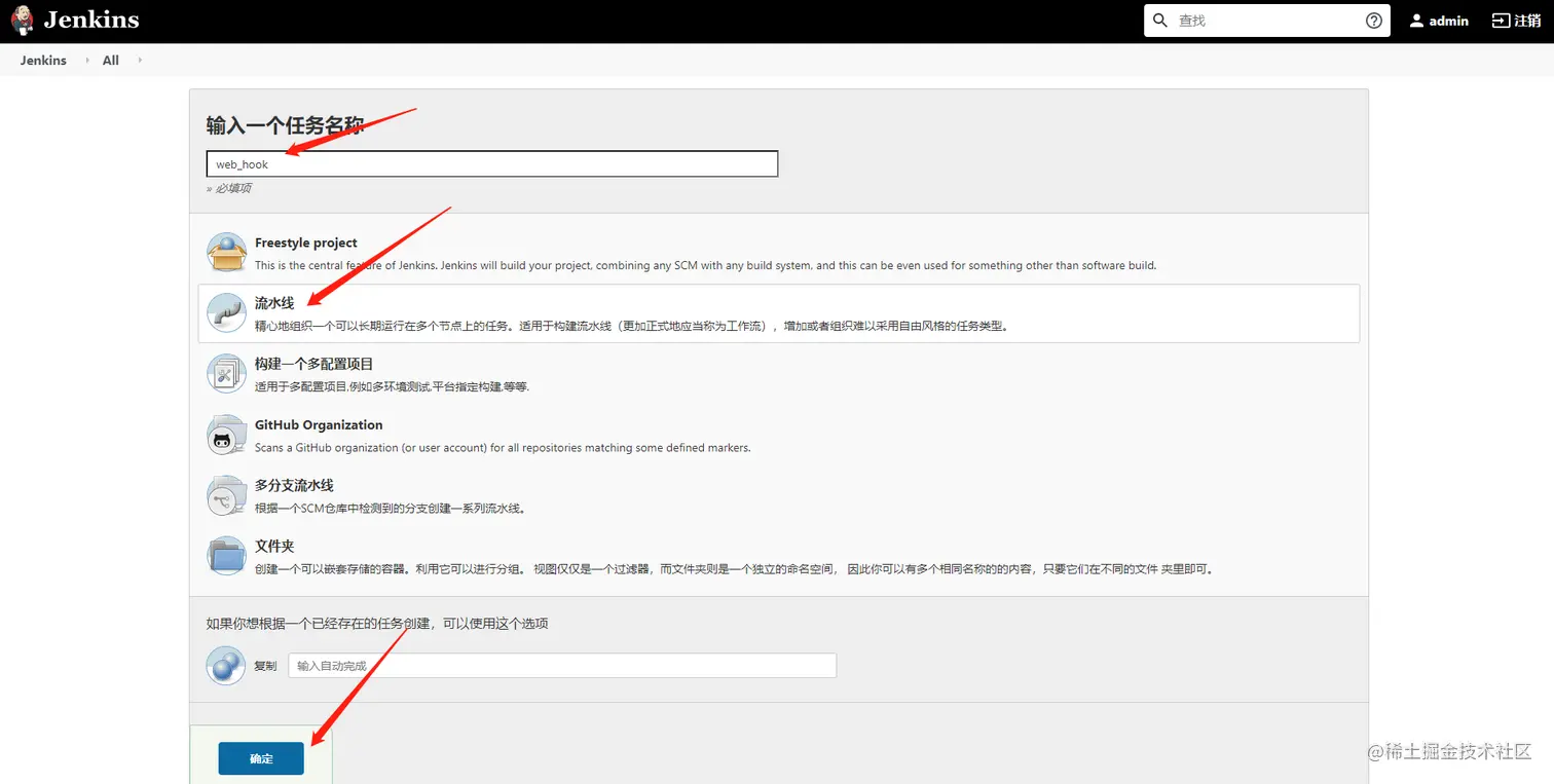 2、返回jenkins首页,点击新建Items,然后填写一个别名并选择流水线,点击确定。