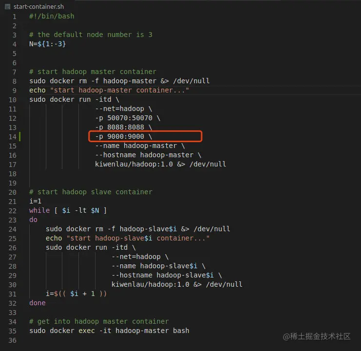 为了方便后续通过 Java API 访问 HDFS,需要修改脚本,添加一个端口映射,将容器的 9000 端口映射到本地的 9000 端口,我们需要在-p 8088:8088 \下添加一行,如下图所示
