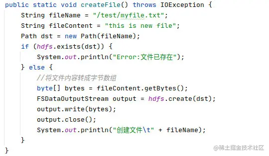 我们先在创建一个文件,创建的文件名为"/test/myfile.txt",文件内容为"this is new file",创建的代码如下: