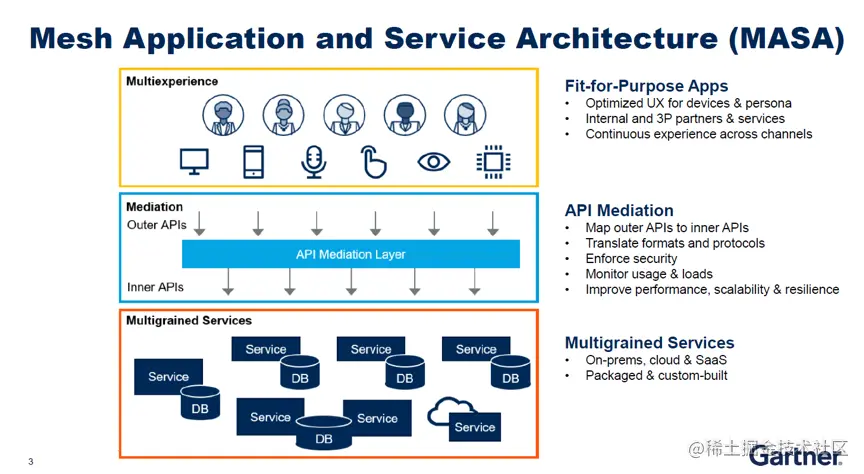 随着云计算、移动化、IoT、AI等技术概念地落地和持续发展,社会的数字化进程在不断加速。Gartner近期发布了新的企业应用架构方法论MASA(Mesh Application and Service Architechture,网格应用和服务架构)[1],融合近5年流行的技术趋势,为广大企业信息化的供应商、开发者和企业用户定义了更广泛的企业数字化应用架构模型。