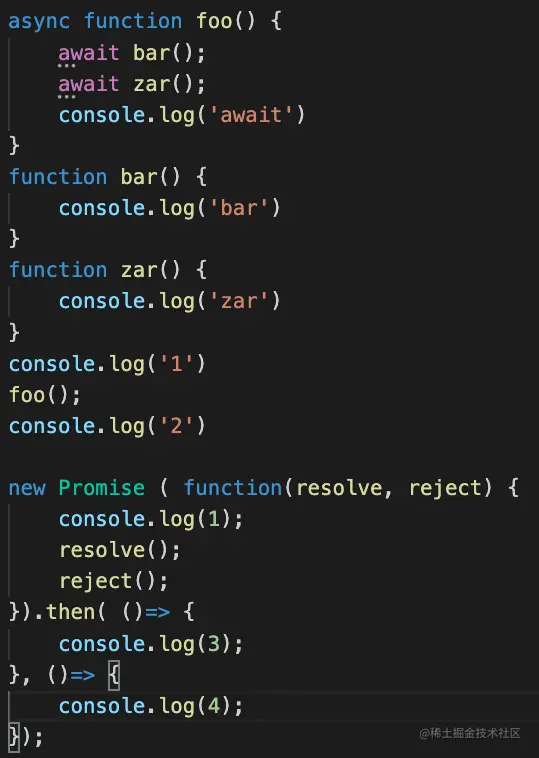 同步代码直接运行('1');异步函数foo()先执行await bar,输出'bar'; 现在只将await zar()放入微任务队列中(下面的同步代码并没有放入微任务队列); 运行同步代码,输出'2'; promise立即执行,输出1; 因为成功所以将console.log(3)放入微任务队列;第一次轮询结束,进入下一个轮询; 微任务的依次执行,输出'zar';将console.log('await')放入微任务队列; 输出3; 输出await;微任务队列也执行完毕.宏任务队列为空;整个执行结束;