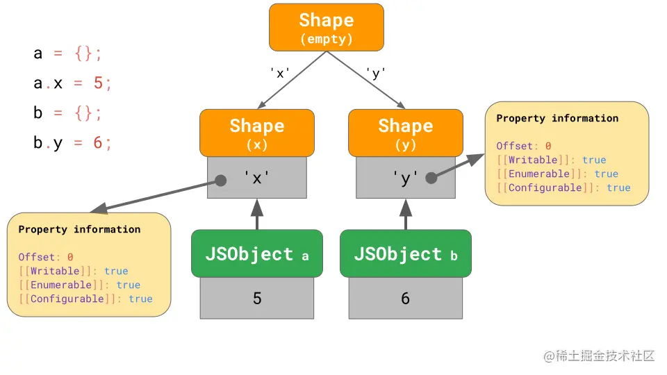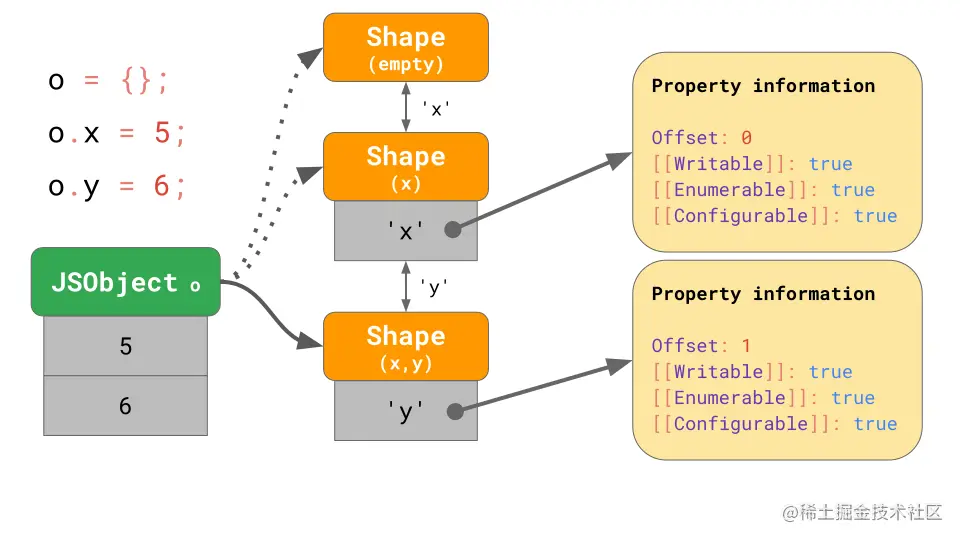 实际上在JS引擎中对象的属性名和属性值是分别存储的,属性值本身被按顺序保存在对象中,而属性名则建立一个列表(Shape),存储每个属性名的“偏移量(offset)”和其他描述符属性。