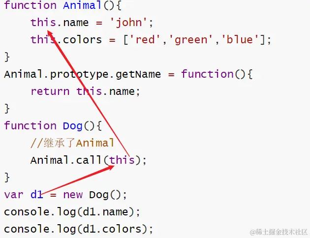 //当new实例的时候,内部构造函数的this指向当前的实例d1,然后在当前的构造函数内部再去通过call调用父类的构造函数,那么父类的构造函数的this指向了d1,但是方法不能被继承下来