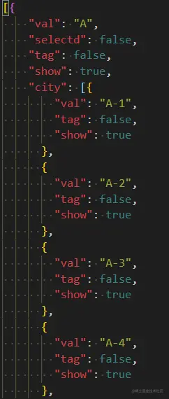 其中,val表示多选的框的值,selected表示该元素的city是否有选中的,也就是控制多选的样式,tag表示该多选框选中,如果是第一级则她的city的tag也全为true。show表示在页面中是否显示这个多选框~