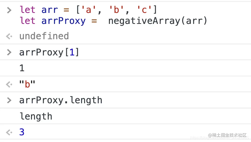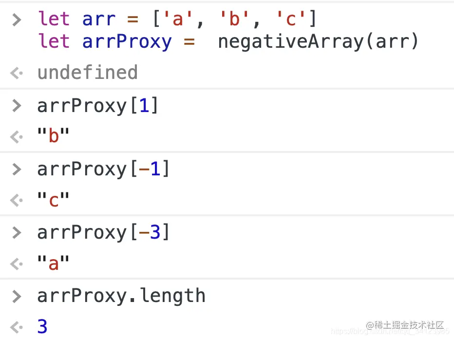 我们可以将数组包装为 Proxy 对象。当用户试图访问负索引时,我们可以通过 Proxy 的 get 方法拦截此操作。然后根据前面定义的规则将负索引转换为正索引,访问就完成了。