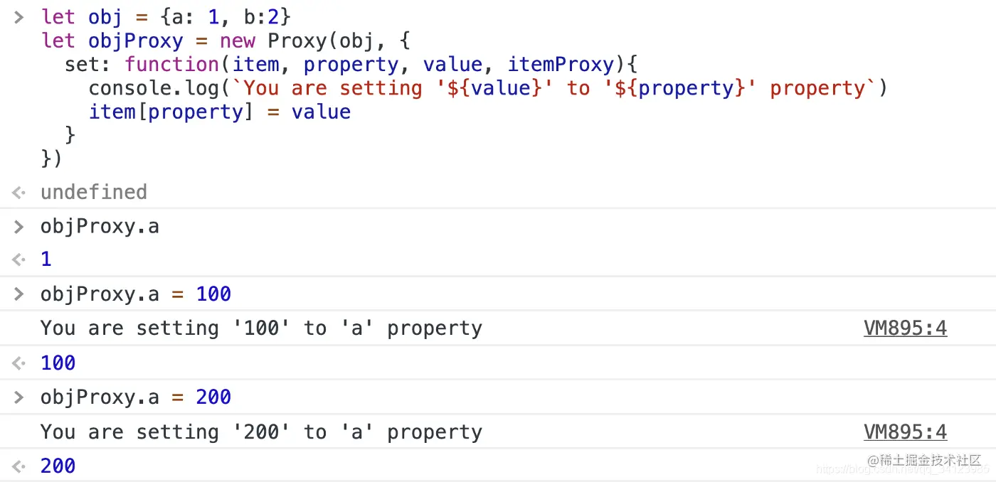 除了拦截对属性的读取之外,我们还可以拦截对属性的修改。比如这样:
