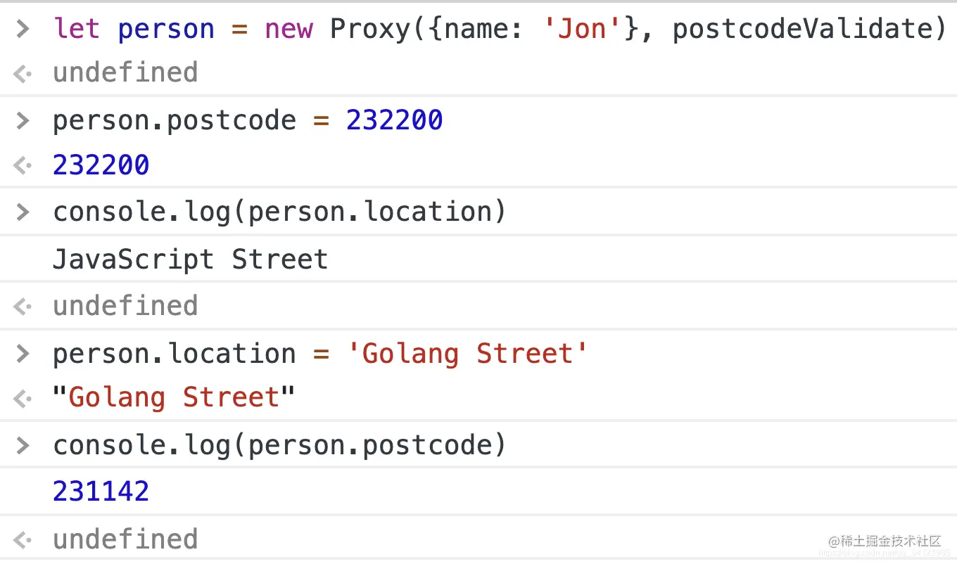 我们希望当我们设置 person.postcode=232200 时自动触发 person.location='JavaScript Street' 。