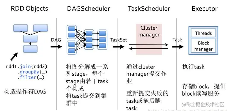 - 创建 RDD 对象,提交之后根据RDD的依赖关系构建DAG图,DAG图提交给DAGScheduler进行解析。