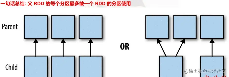 - 1个父RDD对应非全部多个子RDD分区,比如groupByKey,reduceByKey,sortByKey等算子