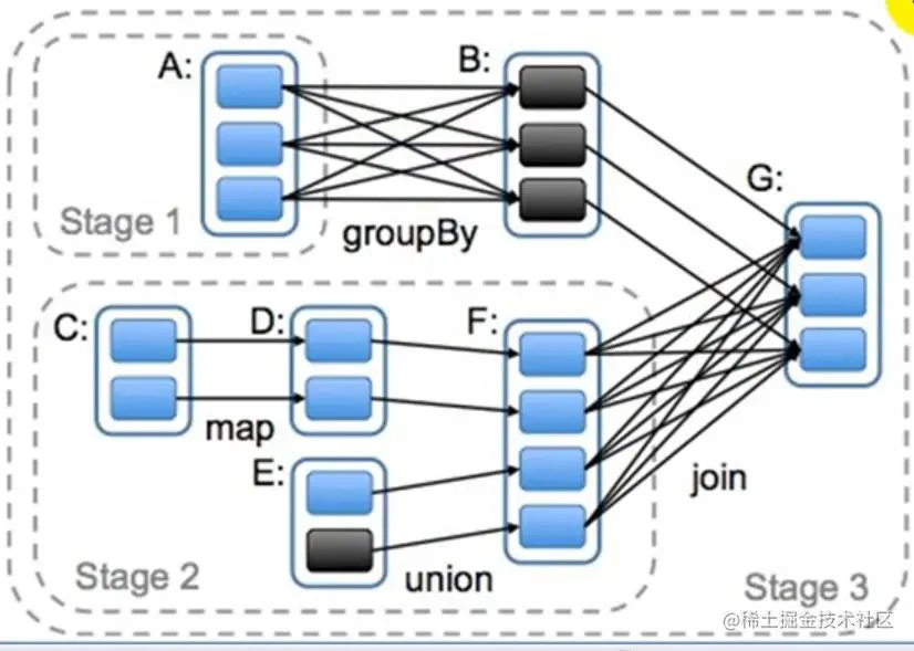 因此spark划分stage的整体思路是:从后往前推,遇到宽依赖就断开,划分为一个stage;遇到窄依赖就将这个RDD加入该stage中。因此在图2中RDD C,RDD D,RDD E,RDD F被构建在一个stage中,RDD A被构建在一个单独的Stage中,而RDD B和RDD G又被构建在同一个stage中。