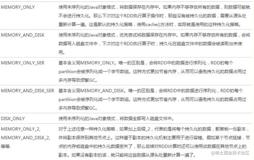 - 通常不建议使用DISK_ONLY和后缀为_2的级别:因为完全基于磁盘文件进行数据的读写,会导致性能急剧降低,有时还不如重新计算一次所有RDD。后缀为_2的级别,必须将所有数据都复制一份副本,并发送到其他节点上,数据复制以及网络传输会导致较大的性能开销,除非是要求作业的高可用性,否则不建议使用。