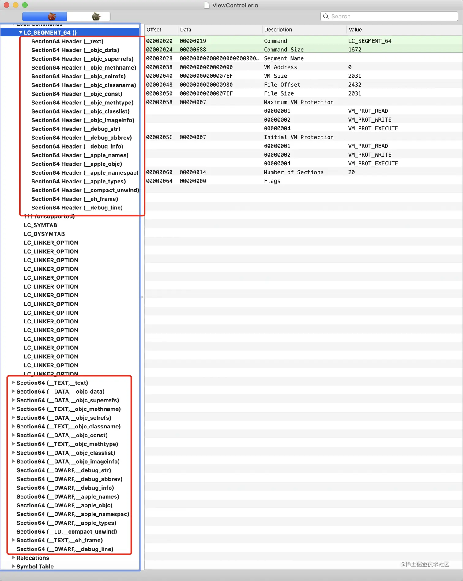 Load Commands 中关于映射的段的详细信息都可以在 MachOView 中查看到,这些是一一对应的:
