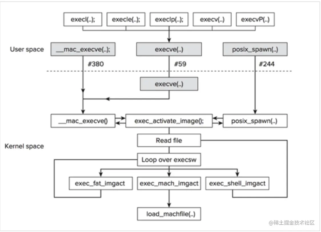 加载Mach-O文件,内核会fork进程,并对进程进行一些基本操作,比如为进程分配虚拟内存、为进程创建主线程、代码签名等。整个过程可以在XNU的源码中查看。