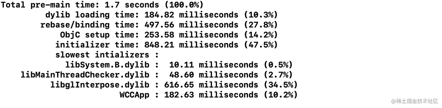 可以看到main()方法之前的时间由dylib loading ,rebse/binding,ObjC setup和initializer四个耗时的部分组成。