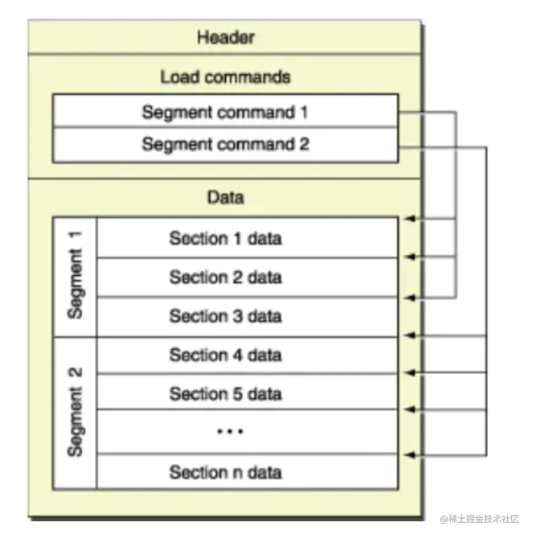 Mach-O格式的文件,基本结构都是由Header,Load commands和Data三部分构成: