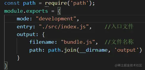 const path = require('path');module.exports = { mode: "development", entry: "./src/index.js", //入口文件 output: { filename: "bundle.js", //文件名称 path: path.join(__dirname, 'output') //输出目录,这里需要借助path模块 }}