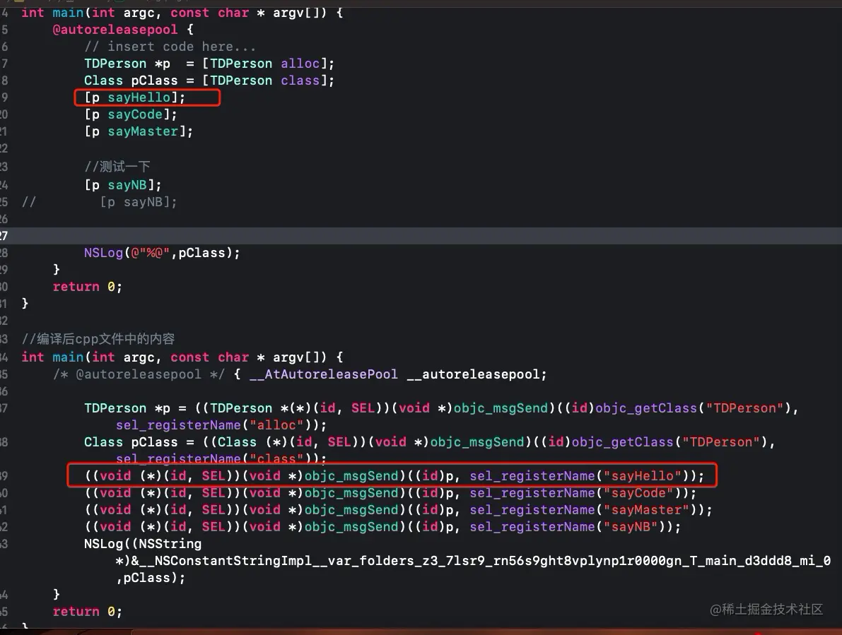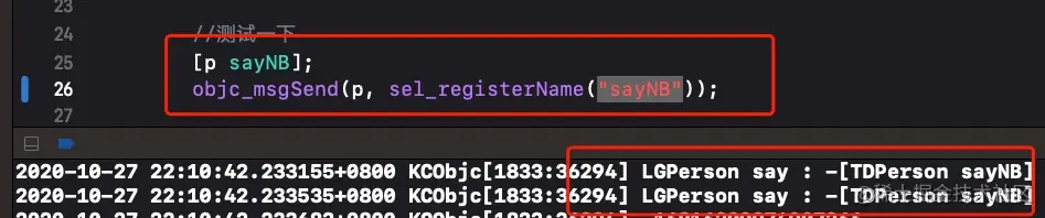 可以发现通过实例调用方法和objc_msgSend转发消息得到的结果是一致的,从而印证的上述的结论