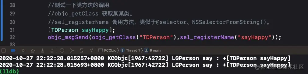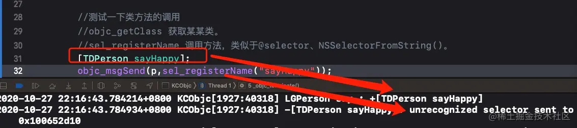 将objc_msgSend参数中的中的TDPerson的实例换成TDPerson再试一下发现类方法的调用如果使用objc_msgSend实现只需要类为传参传递过去就好了,同时也验证了类方法存储在类中的说法