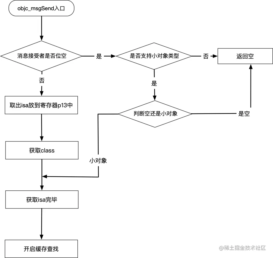 查找过程会发现_objc_msgSend是使用汇编实现的,然后查找过程中会发现好几个文件都有该方法的实现,应为我们的真机是arm64架构的所以我们只需要查看arm64.s文件中的objc_msgSend实现大致流程如下//objc_msgSend方法入口 ENTRY _objc_msgSend UNWIND _objc_msgSend, NoFrame //p0是objc_msgSend第一个参数,也就是消息的接受者 //用消息的接受者和空进行判断 cmp p0, #0 // nil check and tagged pointer check #if SUPPORT_TAGGED_POINTERS //支持小对象类型 直接走LNilOrTagged流程 b.le LNilOrTagged // (MSB tagged pointer looks negative) #else //如果不支持小对象类型直接返回空 b.eq LReturnZero #endif //消息接受者不为空的时候走如下流程 //根据对象去除isa 存放在p13寄存器中 ldr p13, [x0] // p13 = isa //从isa中区出类型新放到p16寄存器中 GetClassFromIsa_p16 p13 // p16 = class LGetIsaDone: // calls imp or objc_msgSend_uncached //找到isa之后就进入到缓存查找流程,也就是快读查找 CacheLookup NORMAL, _objc_msgSend小对象类型概念补充www.jianshu.com/p/e354f9137…