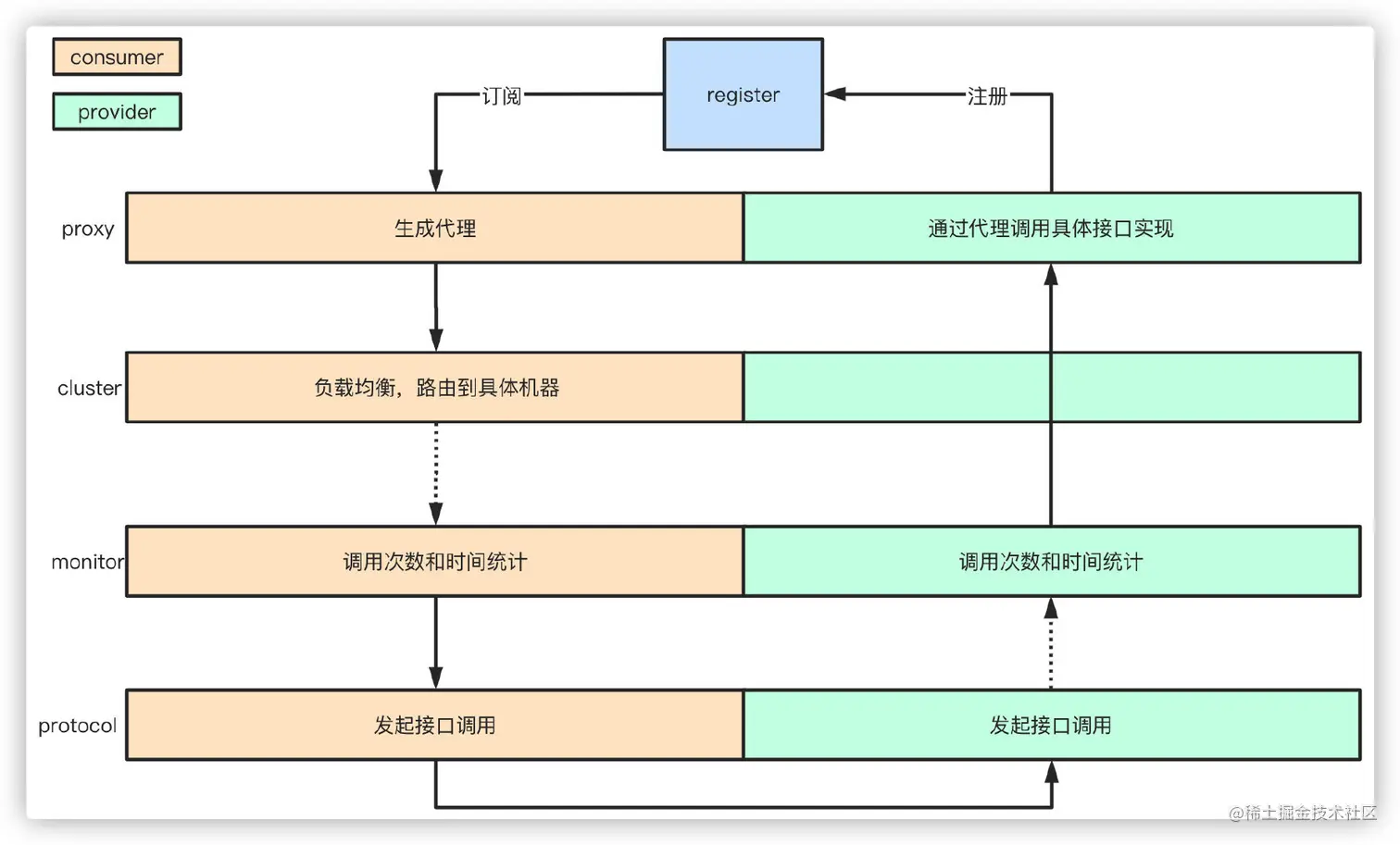 服务启动的时候,provider和consumer根据配置信息,连接到注册中心register,分别向注册中心注册和订阅服务