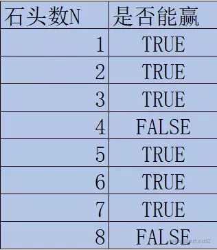 再继续分析到8个石头:对于5,6,7而言,你只需要对应的拿走1,2,3,然后留下4个,则对方必输。但是如果你要面对的是8,不管先拿(1,2,3)个,另一个人都可以通过 8-(1,2,3) ,使得你面对4个石头,则你必输无疑。通过观察,我们发现,好像是只要N是4的倍数,我们就必输无疑。