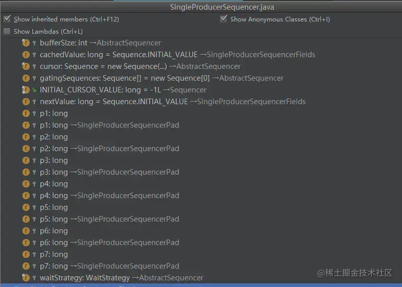 SingleProducerSequencer继承了抽象类SingleProducerSequencerFields,SingleProducerSequencerFields又继承了抽象类SingleProducerSequencerPad。其中SingleProducerSequencerFields是实际放置有效实例变量的位置。