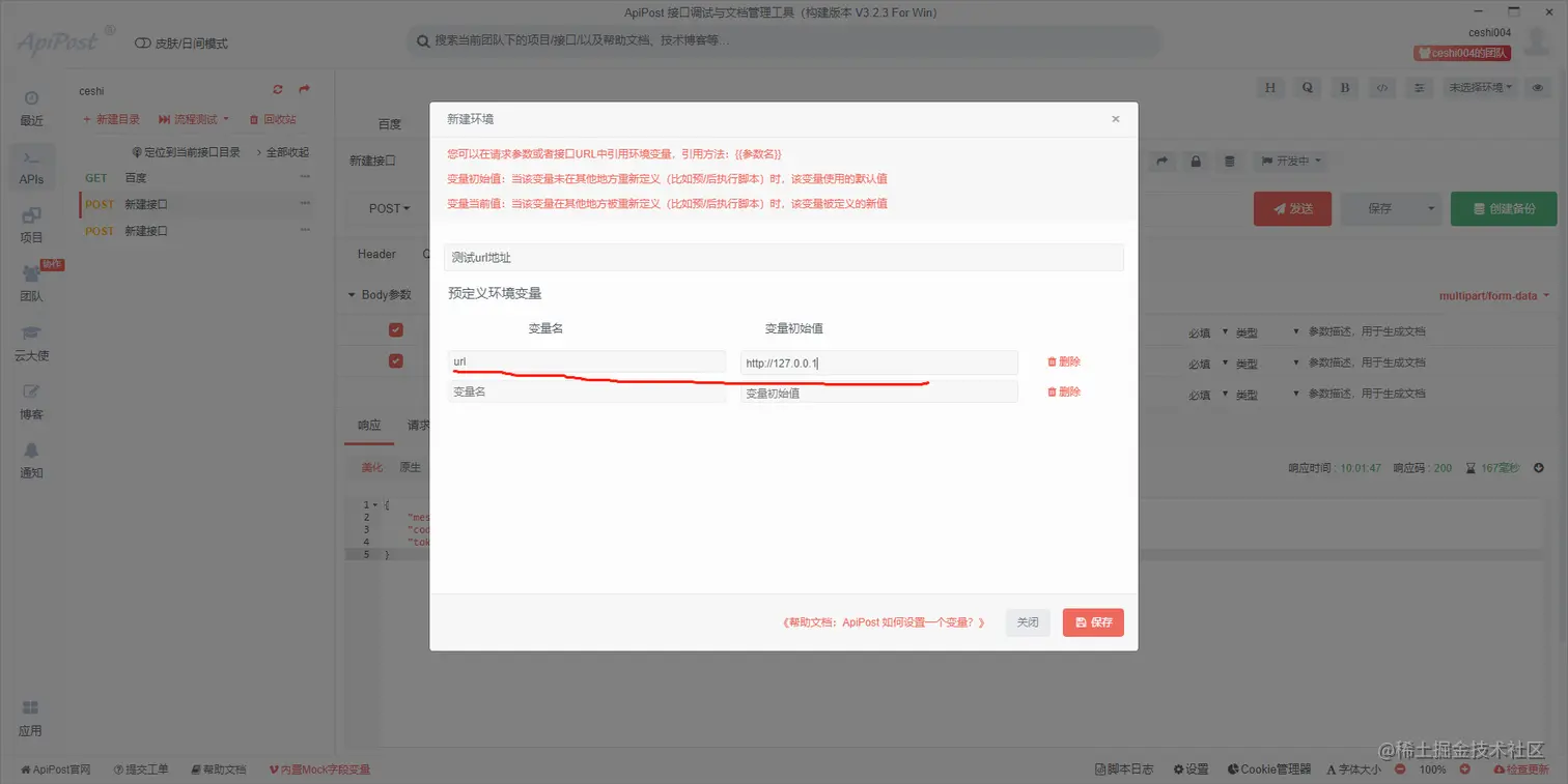 环境选择为新建好的环境,在引用url地址。引用格式为{{变量名}}