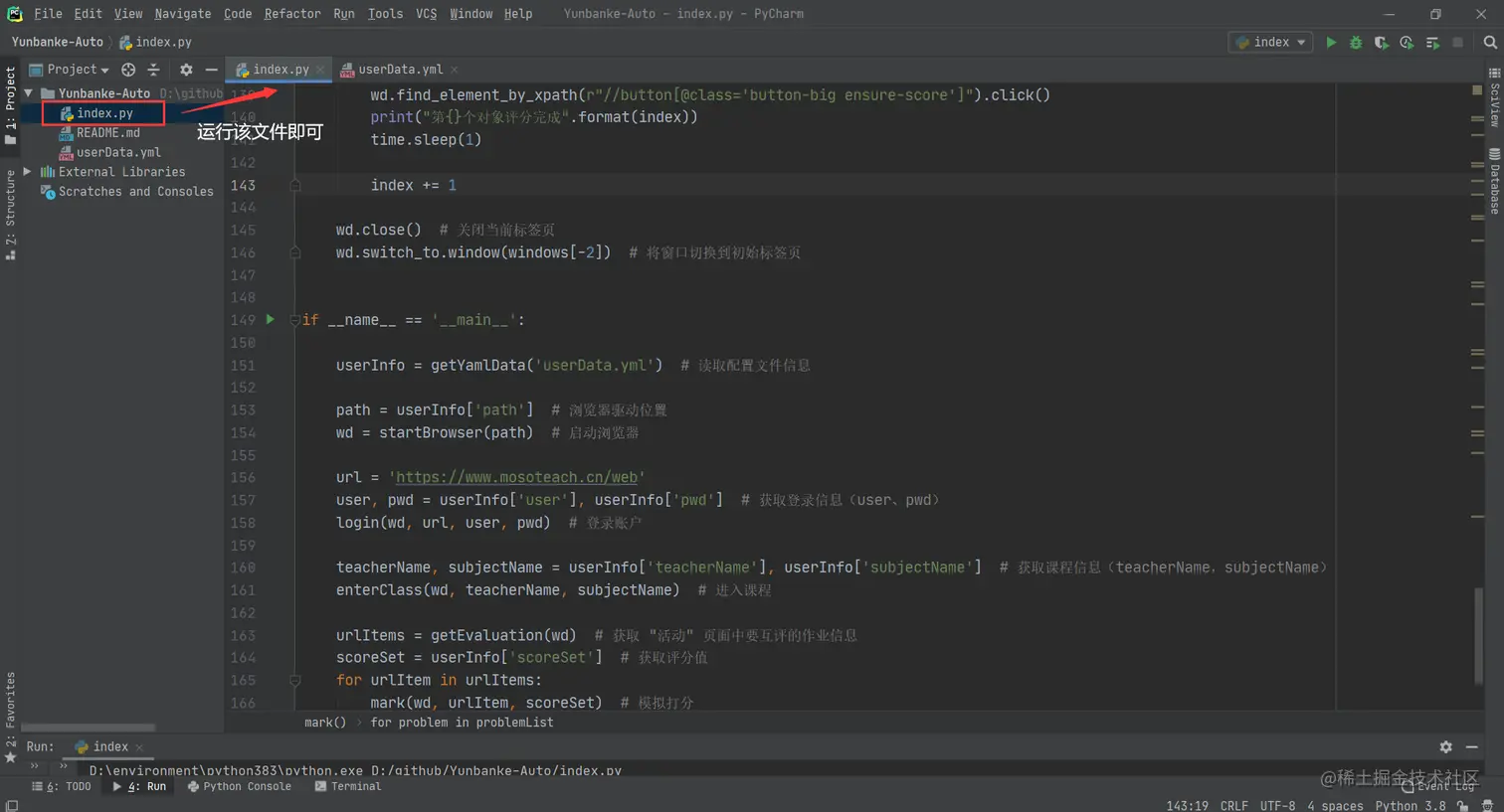 index.py文件即可开始互评项目:注意:程序未进行异常处理,运行本项目前请确保配置文件填写正确