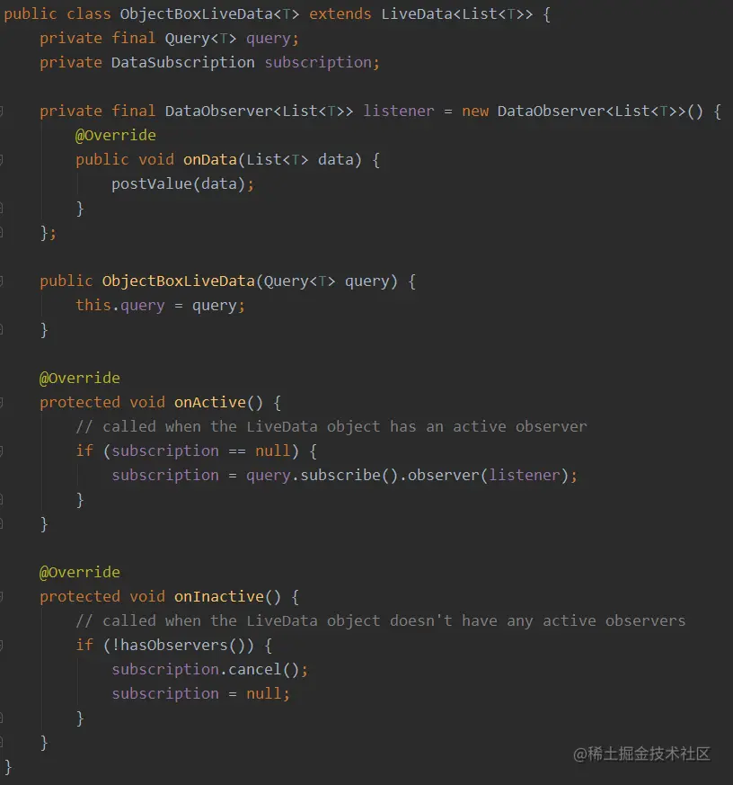 最近尝试将项目重构为基于Android Archicture Components的MVVM架构,数据库用的是ObjectBox,就考虑将LiveData与ObjectBox结合,根据官方文档的指引,我们可以通过类似如下代码将两者结合: