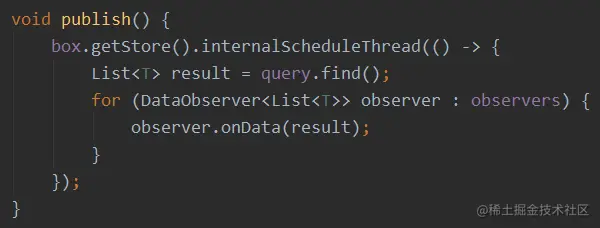 可以看到ObjectBoxLiveData事实上是通过传入Query,观察Query数据的变化,再触发LiveData的通知,相当于是做了一个通知的代理。 所以我们继续看Query的observer方法:
