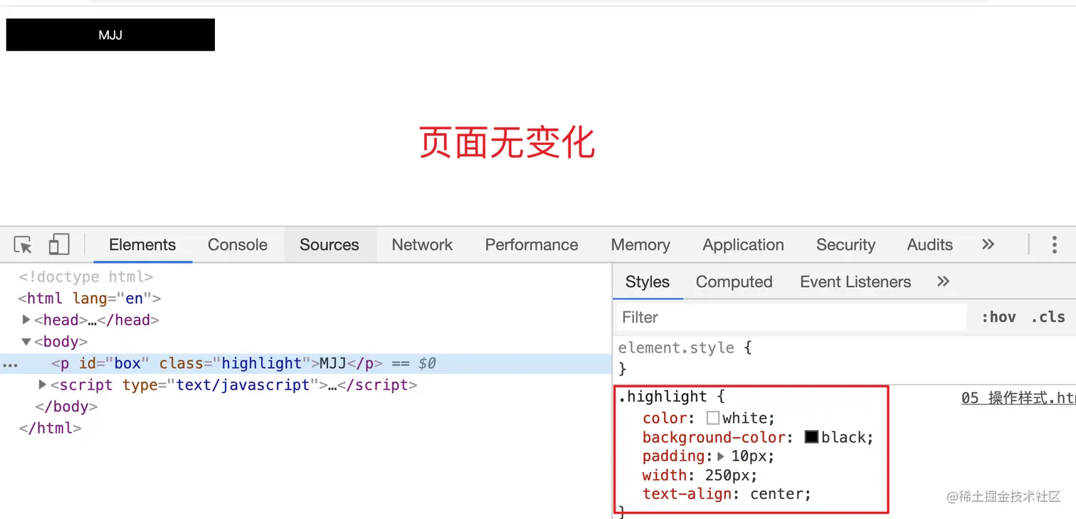 Element.setAttribute()— 这里有两个参数,你想在元素上设置的属性,你要为它设置的值。在这种情况下,我们在段落中设置类名为highlight:var para = document.getElementById('box'); para.setAttribute('class','highlight');