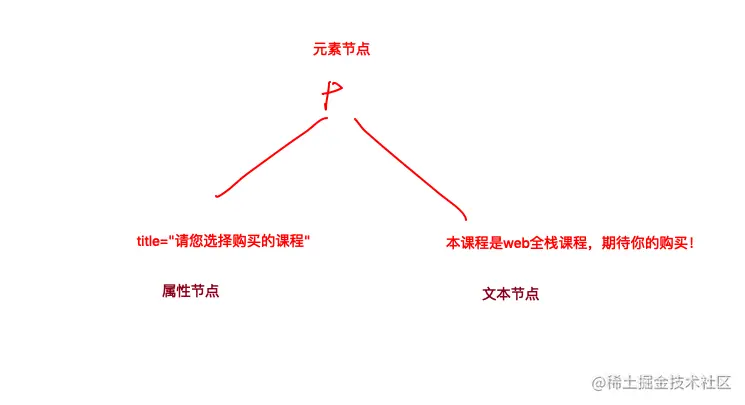 <p title='请您选择购买的课程'>本课程是web全栈课程,期待你的购买!</p>。由此可见,<p>元素包含着文本"本课程是web全栈课程,期待你的购买!"。它是一个文本节点(text node)