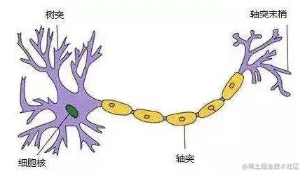 人的神经细胞就像图上这样,枝枝权权很多,远远看上去 边比较粗大 边比较纤细。最上端粗大的这一边就是细胞体的所在,细胞体上有一些小枝权叫做树突,细长的这一条像尾巴一样的东西叫做轴突 不同细胞之间通过树突和轴突相互传递信息,它们的接触点叫突触,准确说是由一个细胞的轴突通过突触将信号传递给另一个细胞的树突。