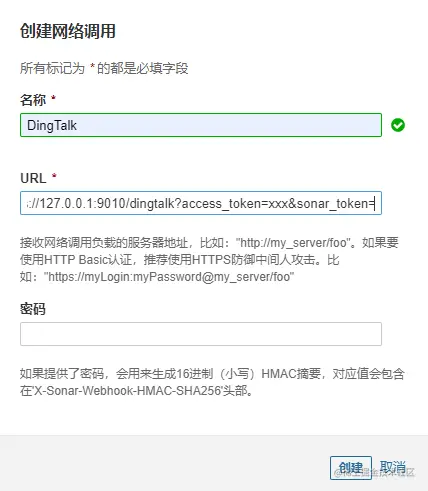 DingTalk,URL填写http://[插件安装电脑ip]:9010/dingtalk?access_token=[配置钉钉机器人时保存的access_token]&sonar_token=[sonar的token]注意:sonar没有开启权限验证时不需要填写