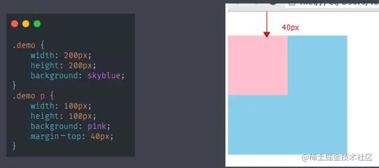 本身父元素与上一个元素的距离是0,子元素如果设置了垂直方向的上边距,会带着父级一起掉下来。